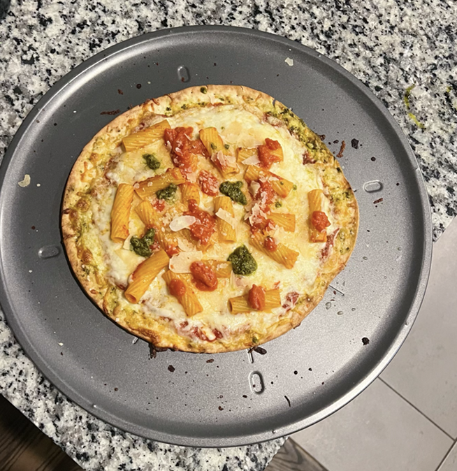 Homemade pizza: topped with pesto, vodka sauce, mozzarella, vodka pasta, and parmesan.