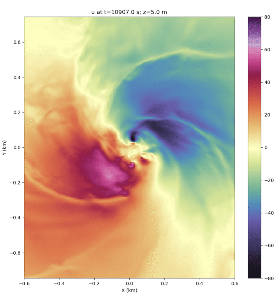 Advancing our understanding of tornado formation and the three-dimensional structure of tornado wind speeds is essential for improving operational severe weather warnings and developing strategies to wind-related hazards. My research group employs high-resolution numerical simulations to investigate how tornadoes interact with complex land surfaces, vegetation, topography, and urban environments (Satrio et al. 2020, Anderson et al. 2022, Lombardo et al. 2025). Our most recent work uses Cloud Model 1 (CM1) to conduct high-resolution, turbulent simulations of tornadoes to capture the two-way interactions between tornado wind fields and the built environment, demonstrating how neighborhoods can significantly alter near-surface wind speeds and increase damage variability.