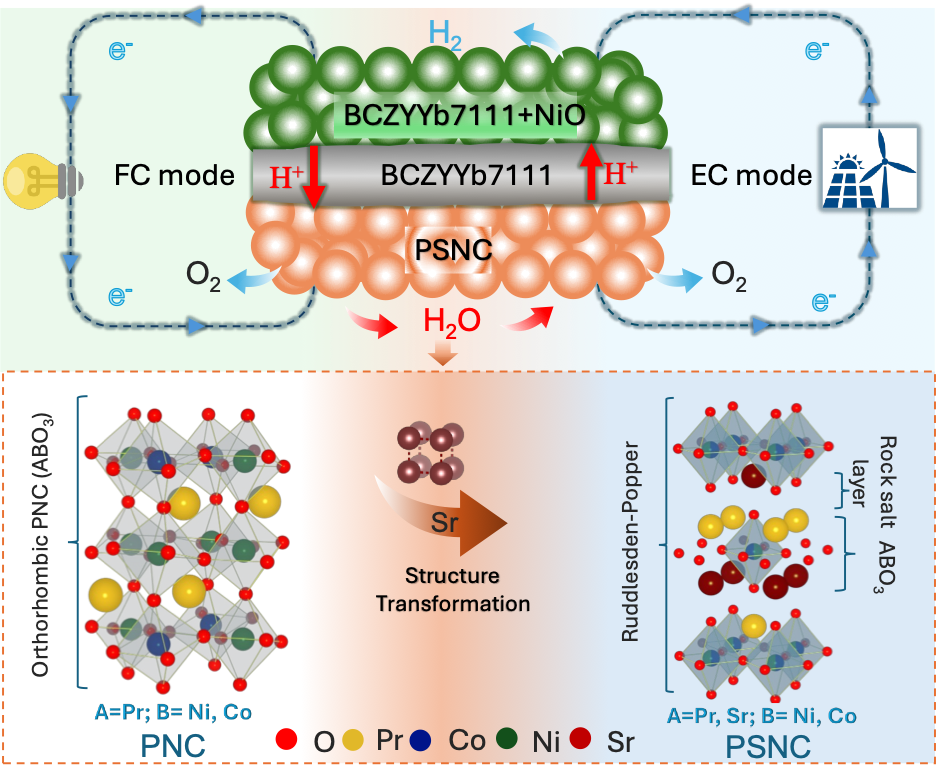 We recently have a work “Structural Transformation of Oxygen Electrode from Perovskite to Ruddlesden-Popper for Enhanced Reversible Hydrogen Production and Power Generation in Protonic Ceramic Cells” accepted by Materials Today (IF=22). In this work, we a novel Ruddlesden-Popper (R-P) structured electrode, (Pr0.6Sr0.4)2Ni0.7Co0.3O4+δ (PSNC), produced by systematic strontium doping in PrNi0.7Co0.3O3-δ (PNC) for intermediate-temperature reversible protonic ceramic electrochemical cells.