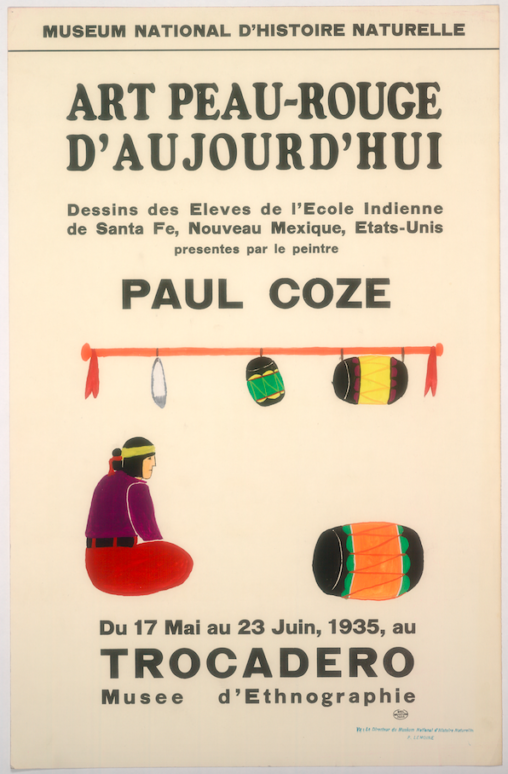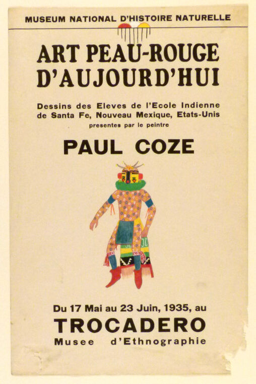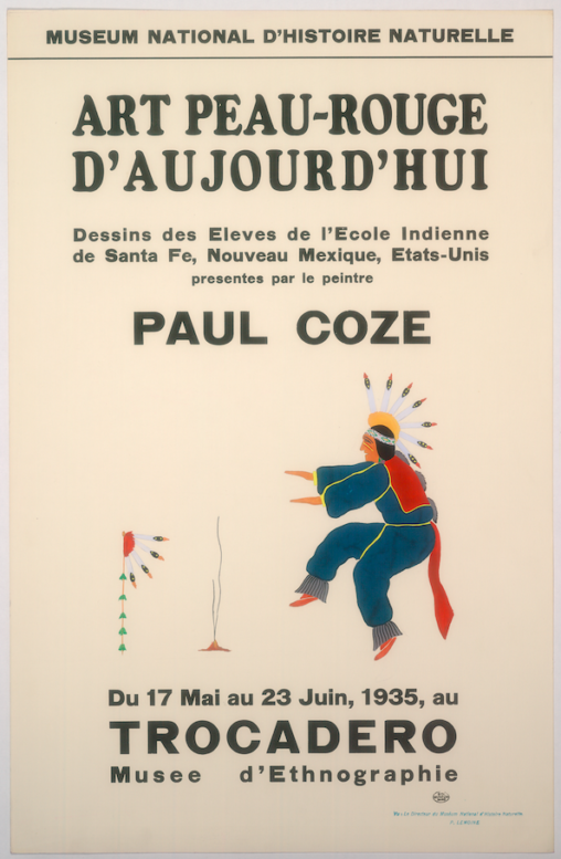 The posters were printed in Santa Fe, New Mexico and painted by Native American students enrolled in the Studio School, a fine arts program at the Santa Fe Indian School, in 1935. Two hundred such posters were sent to Paris to advertise an exhibition of 100 student paintings organized by the French artist Paul Coze, Art Peau-rouge d’aujourd’hui (Art of the Redskin Today) at the Musée d’Ethnographie du Trocadéro from May 17 to June 23, 1935.