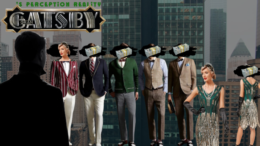 The black silhouette facing the back of the characters represents Nick, the narrator. I included the silhouette over the other characters to represent that we are viewing the image from his perspective. Nicks’ commentary throughout the novel acts as Fitzgeralds’ social commentary on materialism and opulence during the 1920’s. The characters such as Tom, Daisy, and Gatsby have a certain way they want to be perceived by those around them, while Nick allows us to see their true motives and actions. The collage includes money signs over everyones actual face to expose what they are truly motivated by. Nicks commentary allows us to see the narrative differently than we would’ve if Gatsby himself would have described it in his own words- commentary like “Gatsby, who represented everything for which I have an unaffected scorn” would not have been included.